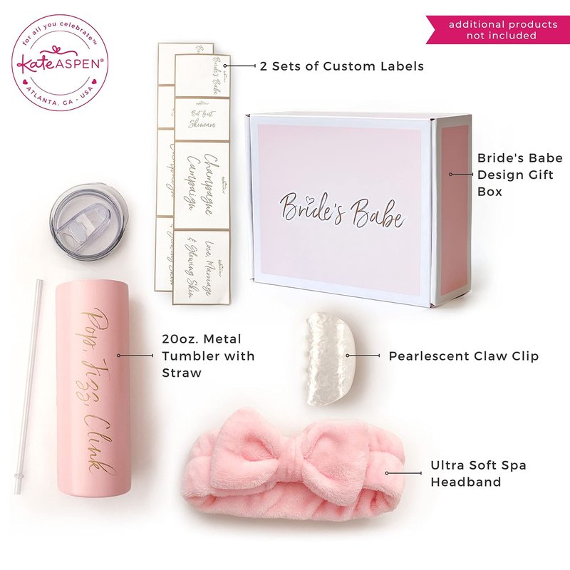 - The Bride's Babe Bridesmaid Gift Box Kit features a blush pink box with white edging an exterior print of "Bride's Babe" and an interior print of "I can't say I do without you". Includes a spa headband. An claw clip, A metal tumbler with that reads "pop, fizz, clink" down the side. Customized " Love, marriage & glowing skin" makeup wipe label. Customized "But first skincare" skincare serum label. Customized "Brides Babe" lip balm label.