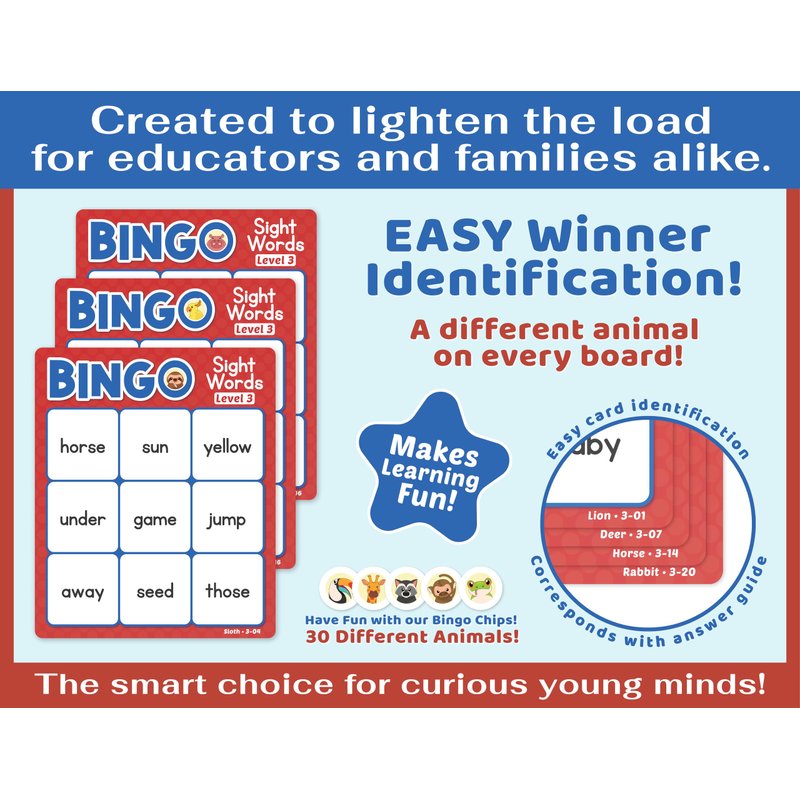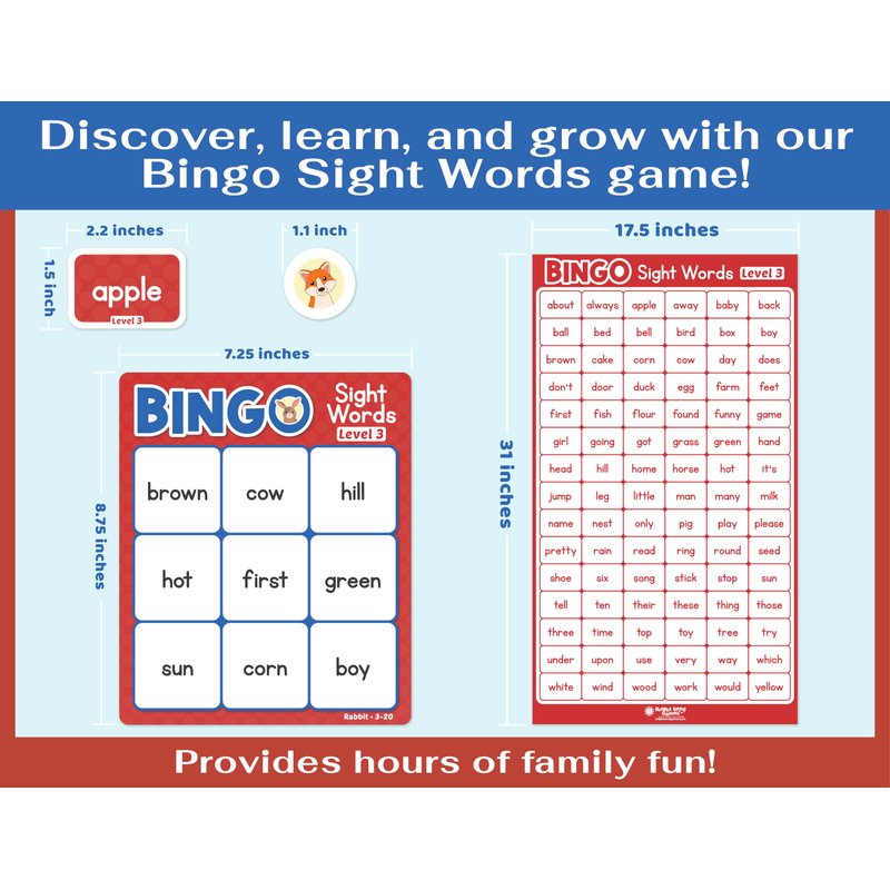 - Our word flash cards for kids ages 4-8 Level 3&4 include 30 double sided Bingo Cards 7.25 x 8.75 inches; 90 double sided Calling Cards plus 10 Challenges; 276 durable plastic Bingo Chips; 1 large Sight Word poster 17.5 x 31 inches and 1 Instruction page