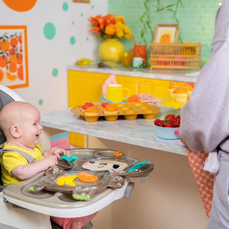 - Compact design fits on a high chair tray and doubles as a high chair toy for early seated play; portable and easy to bring on the go