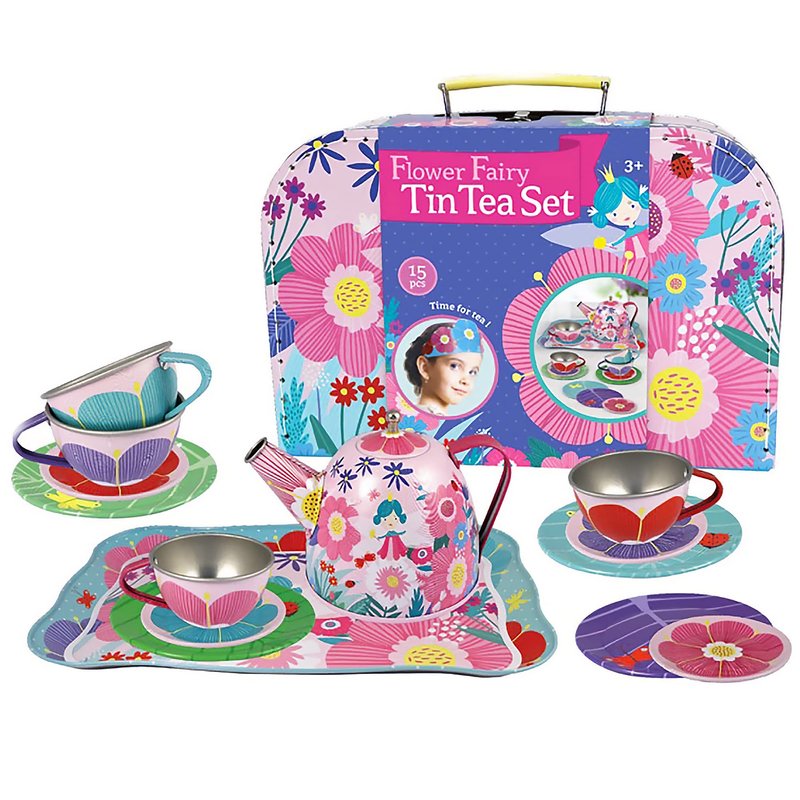 Bright Stripes Kids Tea Set - Pretend Play Tin Tea Set for Girls & Boys | Includes Tea Pot, Cups, Saucers, Plates, Tray, Invitations & Place-Cards for Imaginative Play (Flower Fairy)