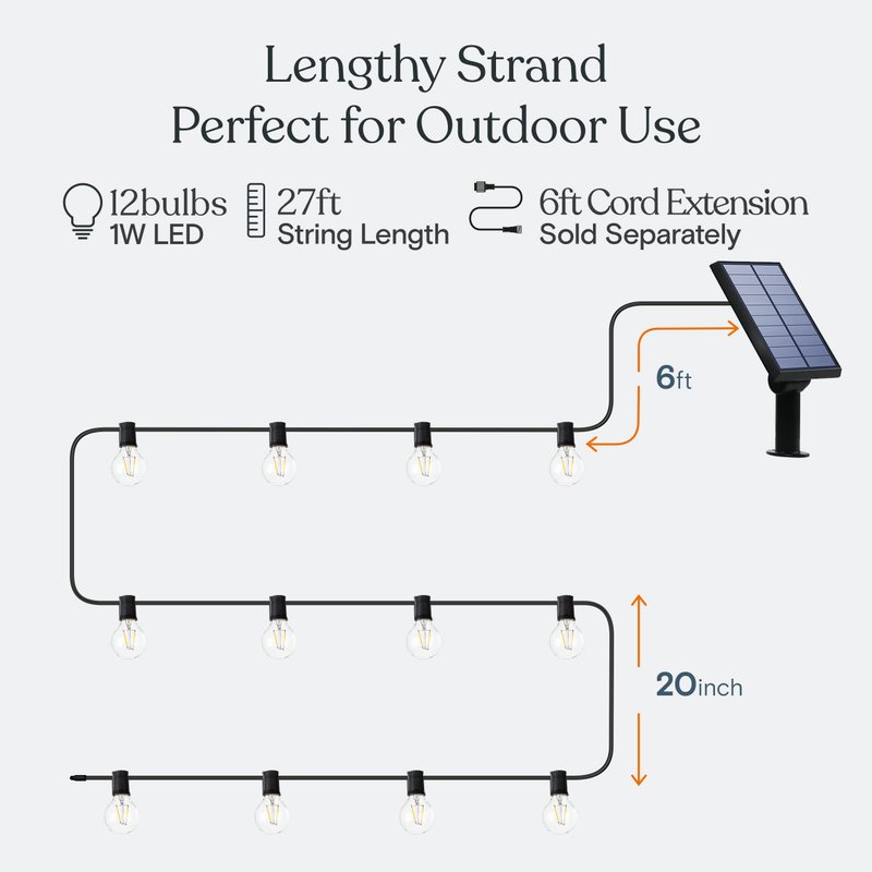 The LED porch lights string in this 27-foot strand use only 1 Watts per bulb, for a total of 12 watts per set. We make our bulbs out of durable plastic shells. They won’t shatter like ordinary glass bulbs, and can be displayed with complete confidence that they won’t break. The bulbs measure 2 inches in diameter. A generous 20'' of space in between bulbs gives you room to decorate on a garden roof, across a gazebo, or in an open-air bistro and style the strands how you like. The total length of the LED lights strand is approximately 27 feet across, 20 feet for the spread of the bulbs, and 6 feet for the cord extending to the solar panel.