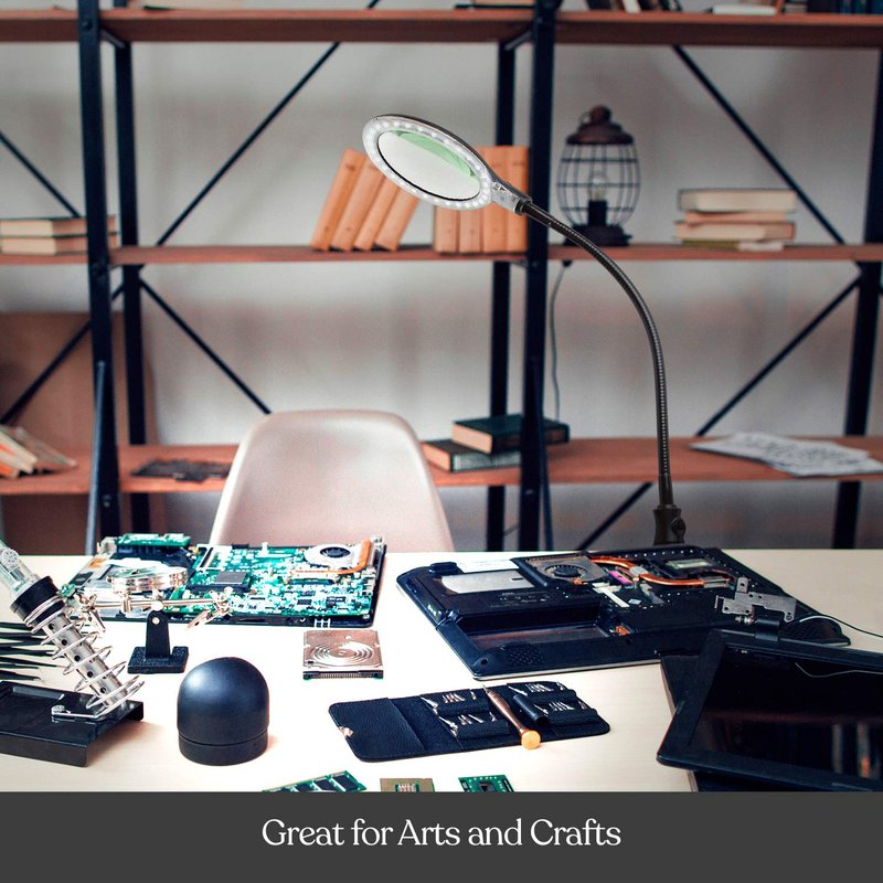 - Adjustable Magnifying Desk Lamp With Gooseneck: The glass lens has a 13.5" adjustable, flexible gooseneck, can be adjusted up and down, you can use the magnifying glasses with light for close work at any angle, freeing both hands. Suitable for repairing electronics, soldering, crocheting, painting, jewelry, facial, manicure, puzzles, etc.