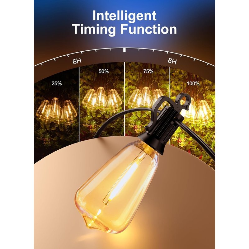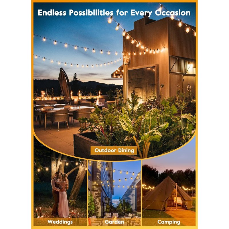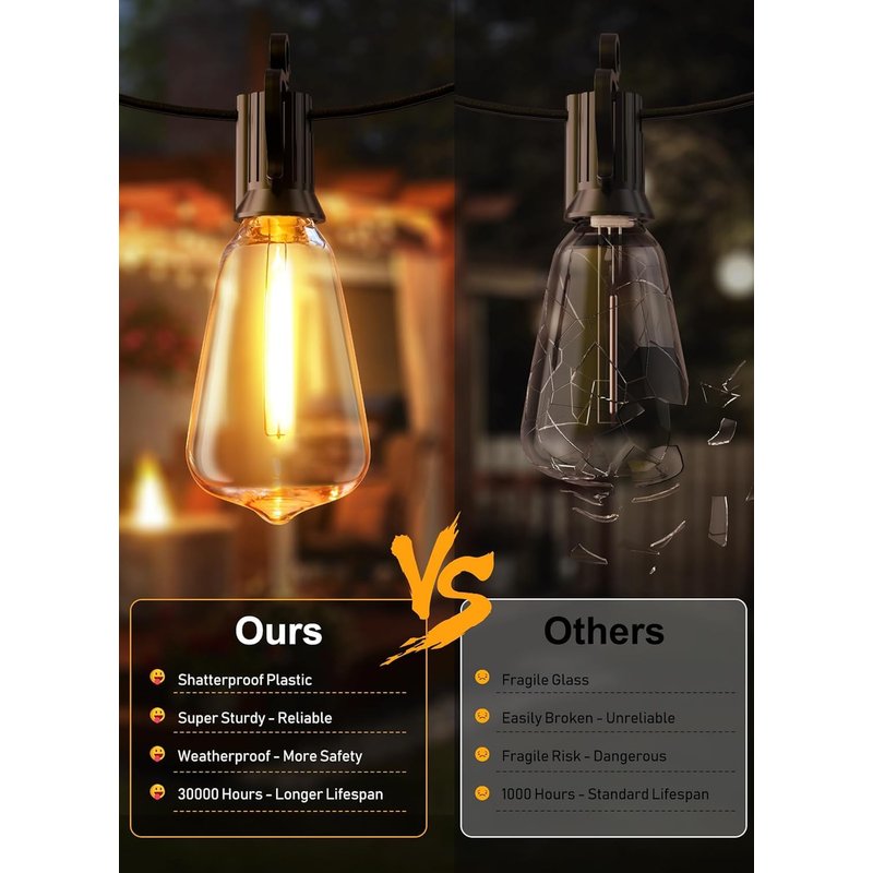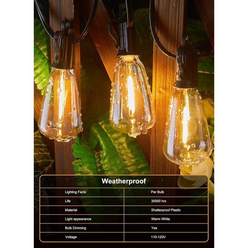- 【Shatterproof & Safer LED String Lights】ST38 Edison outdoor lights are made of PET with impact-resistant, much shatterproof than glass bulb and safer for using even if the string light is facing drop down or blow away situation; Durable string lights can withstand rainy, windy or damp climates, able to withstand most normal weather conditions year round.
