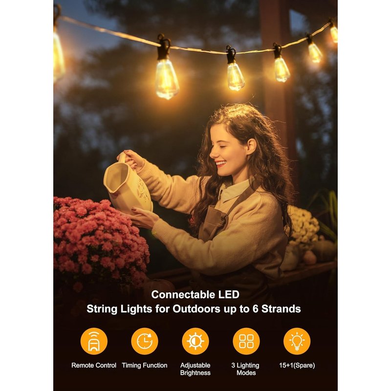 - 【Energy-saving & Last for Years】The outdoor string lights equip with weatherproof strand and 16 shatterproof LED bulbs (1 spares), which are brighter and each consumes dramatically reducing 90% electricity bills compared with incandescent bulbs. Not only that, these ST38 bulbs offer over 30,000-hour of service life and the heavy-duty wires are also upgraded to last for years.