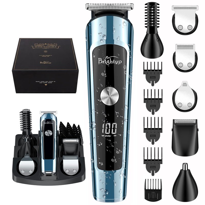 The Brightup beard trimmer for men kit: meets all your needs Hair/ Beard/ Nose/ Ear/ Body/ Design/ Precision Trimmer. All-in-one multi functional grooming kit is a professional precision shaving system design, including 6 trimmer heads and stand base for easy collection and organization. Come with 5 hair trimmer combs (3/4 mm, 3/6/9/12 mm) which can precisely control the length of the hair, styling of beard, body, private, balls, pubic, mustache, nose, ear, facial or groin. gifts for him, mens gifts, gifts for men, beard kit. beard kit, electric razor for men, hair clippers for men. LED Display and USB Rechargeable: The LED display indicates the battery power and reminds you to charge. The built-in rechargeable lithium-ion battery provides up to 120 minutes of run time per charge, and it only takes about 1.8 hours to fully charge. The cordless design makes it easy to use anywhere and is perfect for travel. mens beard trimmer for men manscape men's electric razor for men razors for men man trimmer male nose hair trimmer for men electric shavers for men clippers and trimmers set body hair trimmer for men electric trimmer mens razors for shaving mens electric razors for shaving face mens razors electric shaver hair clippers for men clippers for hair cutting.