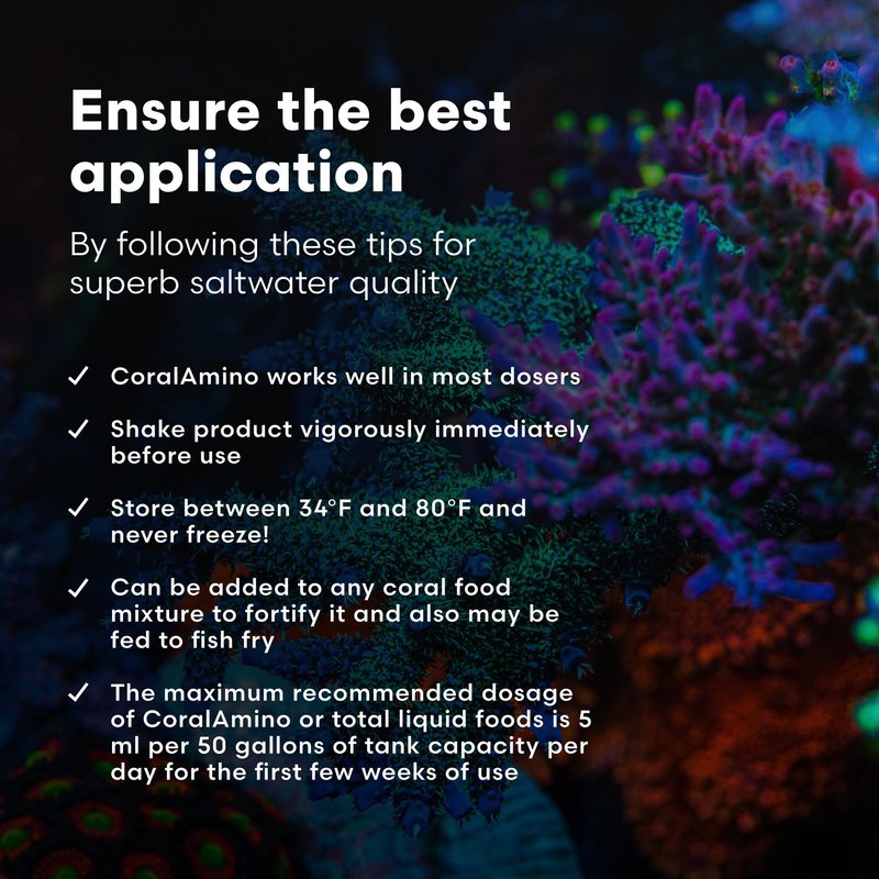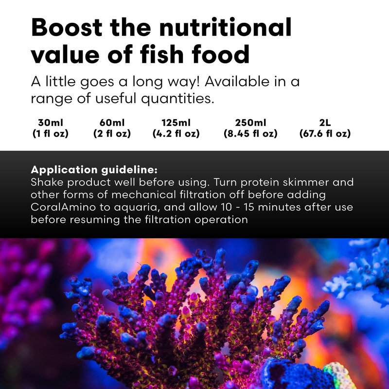 - ENHANCED GROWTH – CoralAmino is an amino acid complex for maximum aquarium coral growth and coloration in all corals. This free-form amino acid supplement closely mirrors the natural ratios found in stony corals, boosting the corals' assimilation of proteins for building proteins for coral tissue growth and tissue repair