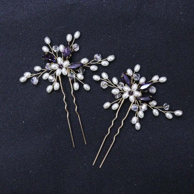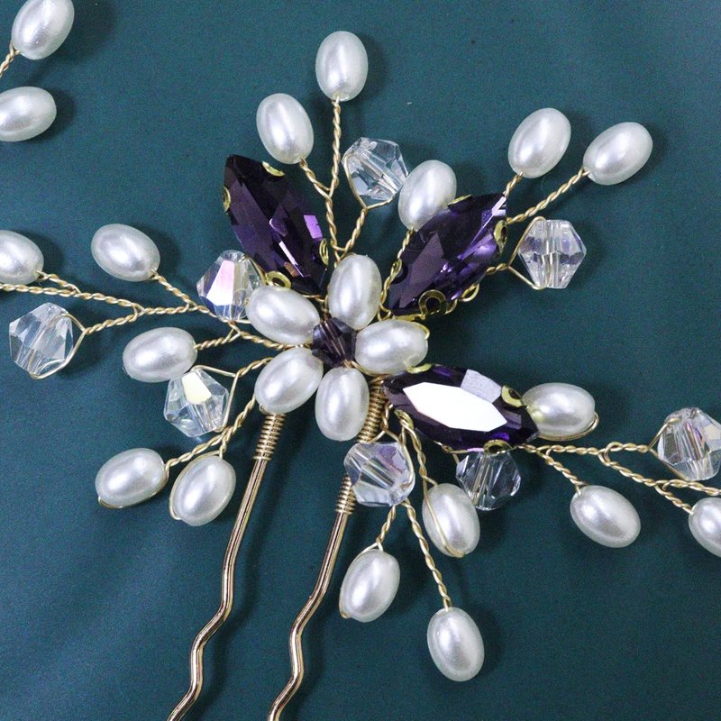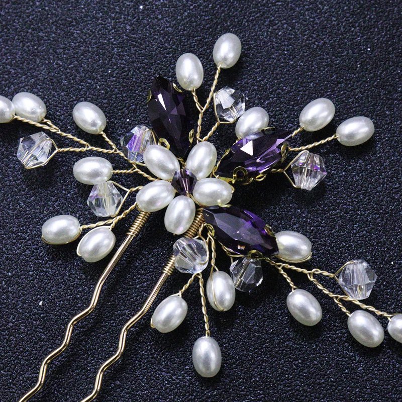 Brihasory Bridal Hair Pin Wedding Hair Accessories for Women Bride To Be Gifts Handmade Pearls Emerald Green Purple Rhinestone Gold Hair Clip 2PCS Banquet Prom Hair Accessory for Curly Girls (Purple)