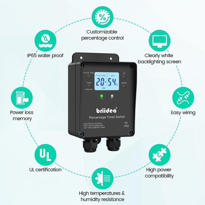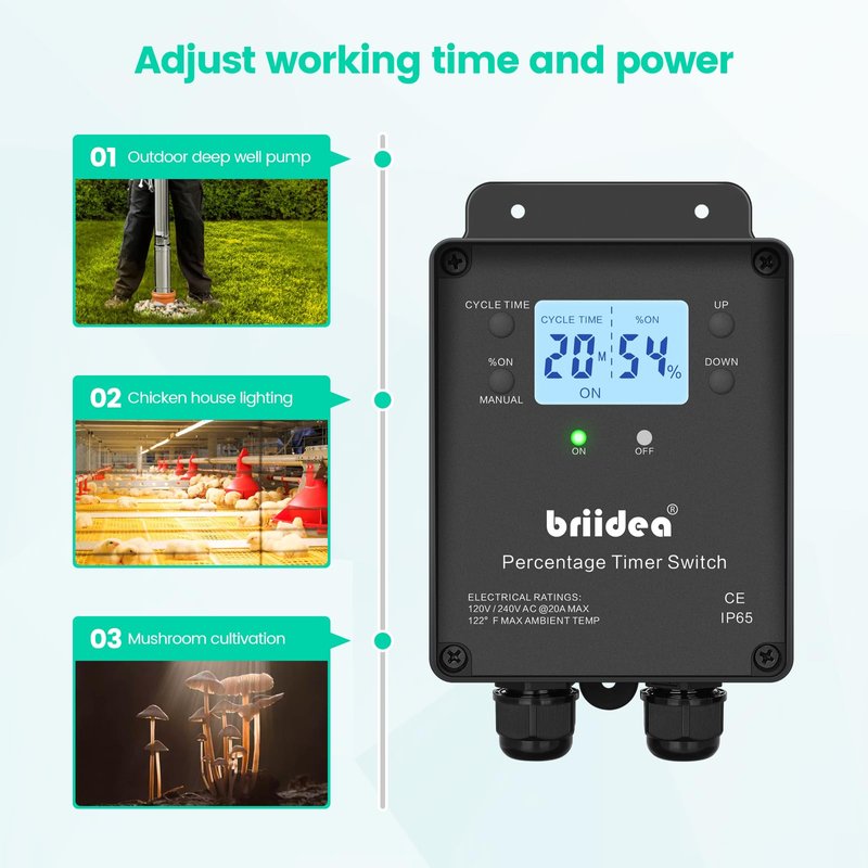- SMART TIMER FOR MULTIPLE APPLICATIONS: Provides precise control of device activation based on time and adjustable percentage settings. Perfect for managing outdoor pumps, ventilation fans, or maintaining temperature and humidity in farms, poultry houses, and mushroom cultivation