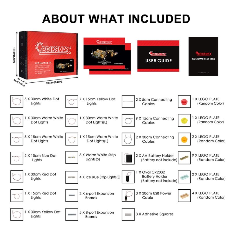 - Package contains dot lights, expansion boards, connecting cables, battery holder(batteries not included), adhesive squares, and instruction.