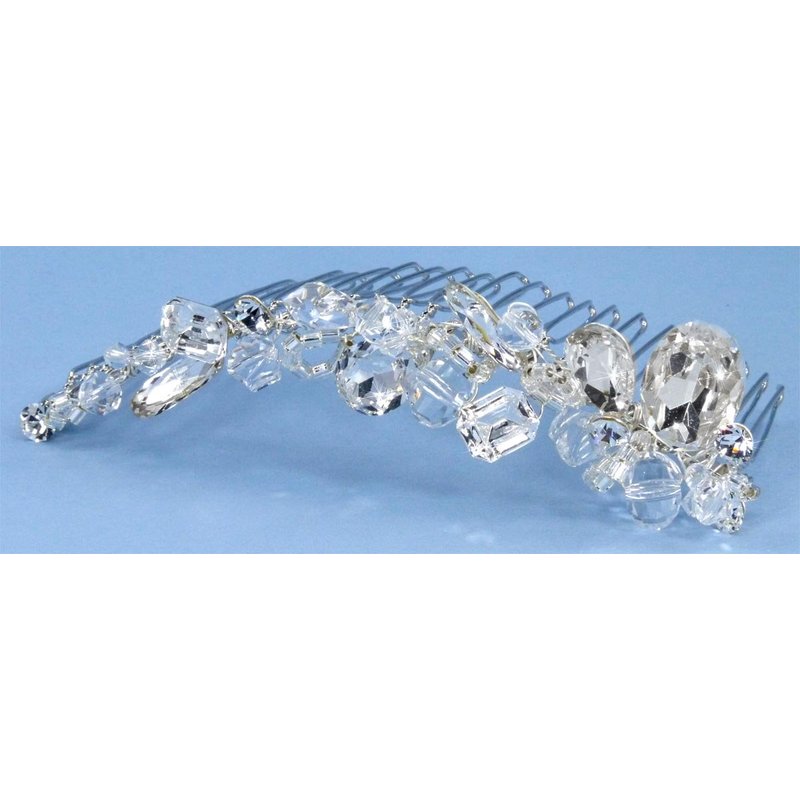 This brilliantly sparkling bridal comb of chunky Austrian rhinestones, crystal beads and bugle beads is your perfect choice for wedding, prom, quinceañera, and other special occasions. The ornamented section measures about 4 1/2 inches by 1 1/8 inches high at tallest point.