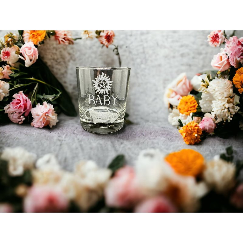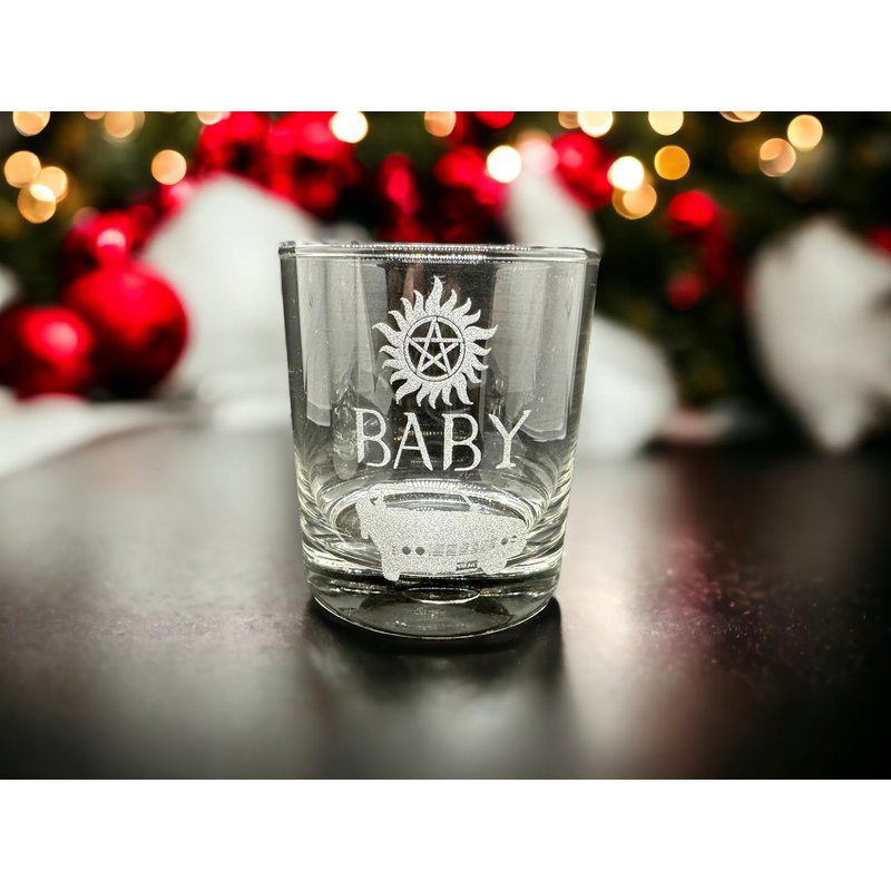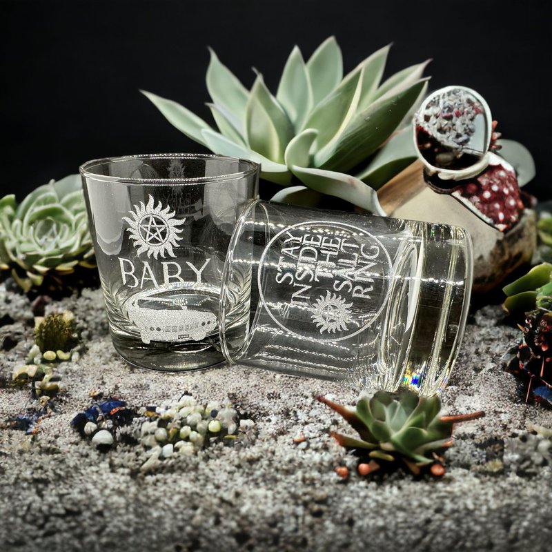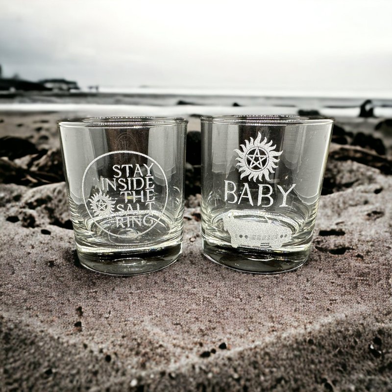 Looking for a gift that packs a punch for the Supernatural fan in your life? Look no further than this stunning set of two engraved Rocks glasses with iconic designs inspired by the hit series. Crafted from high-quality glass and expertly engraved with intricate detailing, these Supernatural whiskey glasses feature two of the show's most beloved and recognizable motifs: Baby Dean's Car and Stay Inside The Salt Ring.These designs are sure to thrill any fan of the show and make a statement in any barware collection. Not only are these glasses striking to look at, but they're also sturdy and functional. Perfect for sipping whiskey or other spirits, these Rocks glasses are the perfect addition to any Supernatural-themed bar or home. Whether purchased as a gift for a Supernatural fanatic or as a treat for yourself, these supernatural barware glasses are sure to become a cherished piece of any collection. So why wait? Add some otherworldly flair to your drinking routine with these remarkable glasses today! The perfect supernatural fan gift whiskey glasses! Drink while watching your favorite tv show in Winchester Style with this gorgeous rocks glass set of 2. This drinking glass set is perfect for the Supernatural TV show fan, Dean Winchester fan, or Sam Winchester fan in your life! Includes one of each glass: Anti-Possession symbol with Baby and Stay Inside The Salt Ring. Permanent engraving. Keep safe from Crowley while drinking your beverage! Supernatural: Saving people, hunting things. This set pairs perfectly with any of our SPN coasters for an awesome gift! These are high quality clear drinking glasses etched on one side. They each can hold 10oz and are very sturdy and built to last. They fit great in your hand and are about 4" tall. Etching is permanent and does not fade over time. Dishwasher safe. Includes two rocks glasses. Etched glassware designs are incredibly elegant and sophisticated because the details of the design are made up of nothing but the glass itself. No transfers, vinyl, or paint are used. Etching is elegant, permanent, and will not fade over time.