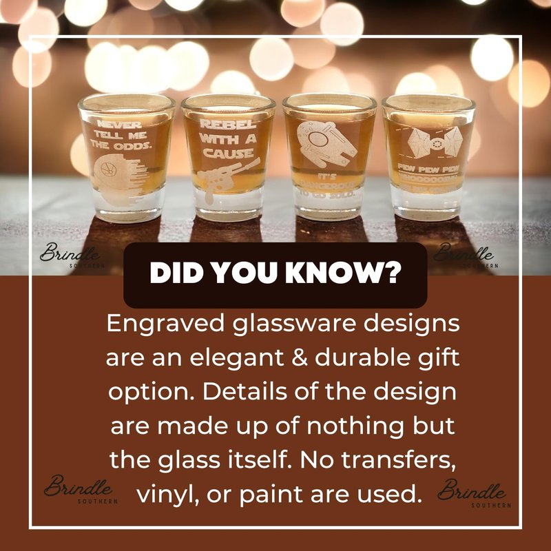- {ELEGANT GIFT:} Each glass is professionally engraved with great attention to detail. Engraved glassware designs are incredibly elegant and sophisticated because the details of the design are made up of nothing but the glass itself. No transfers, vinyl, or paint are used.