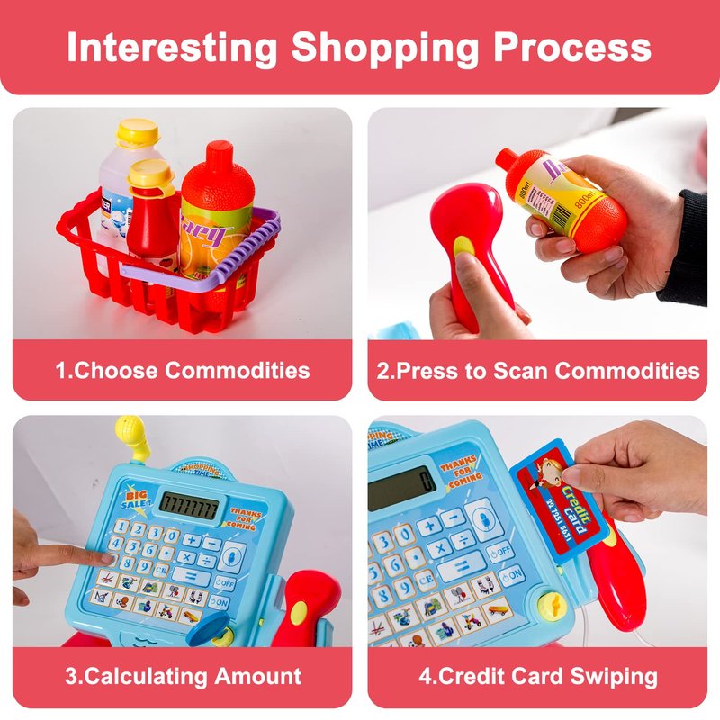 - 【Complete Play Toy Accessories】: This cash register for kids is equipped with pretend play money, 9 plastic coins, pretend credit card, pretend key, and 4 drink sets. What’s more, we specially designed a shopping basket for children to choose goods.This toy cash register also has scanner and microphone. Toddlers will find it more realistic and have fun with the pretend toys during their role play games.
