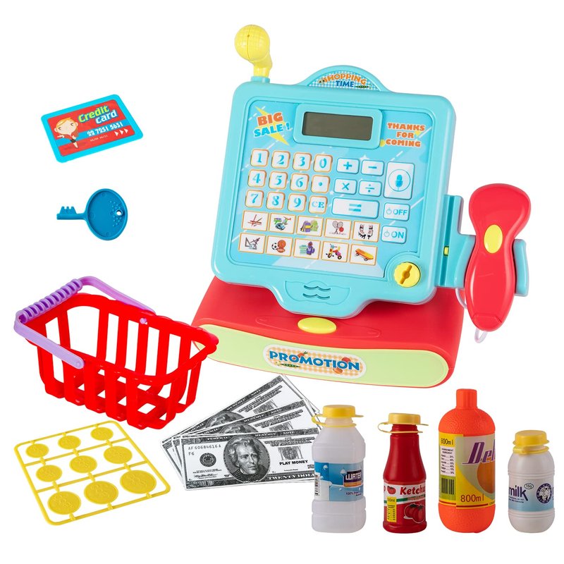 The realistic cash register with sounds, drawers and microphone is interesting and educational. Includes a supply of pretend bills and coins. Also comes with drink set. Kids learn about money while they are having fun.
