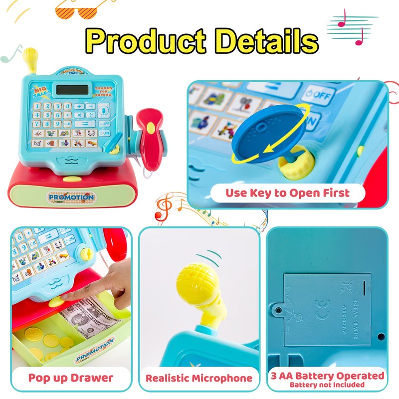 - 【Kids-friendly & Durable Materials】: Made of premium ABS & PP materials, this toy cash register is durable enough for long service life. This cash register toy can accompany your child's growth. Meanwhile, the edges of this cash register are rounded which will provide your lovely toddler with all-round protection.