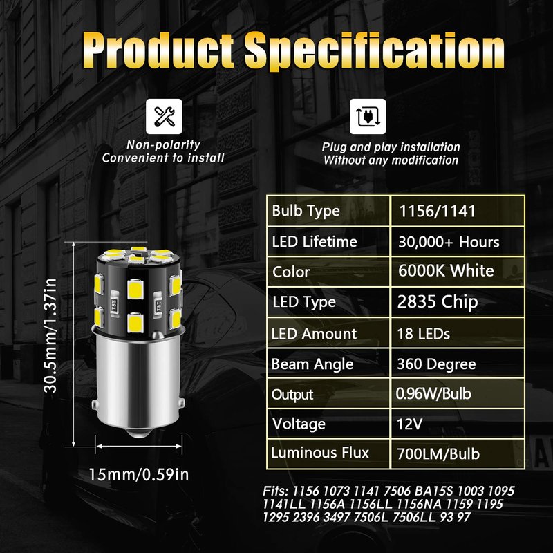Replaces OE bulbs #: 1156 1141 1003 7506 BA15S 1073 1095 1093 1129 1156A 1156NA 1195 12088 1295 1295NA 199 2396 3497 5007 5008 631 93 97 97A 97NA 87 1159 1259 1459 1619 1651 1680 3496 7527 1073LL 1141LL 1156ALL 1156LL 3497LL 63 631LL 7506L 7506LL 7533 93LL etc.