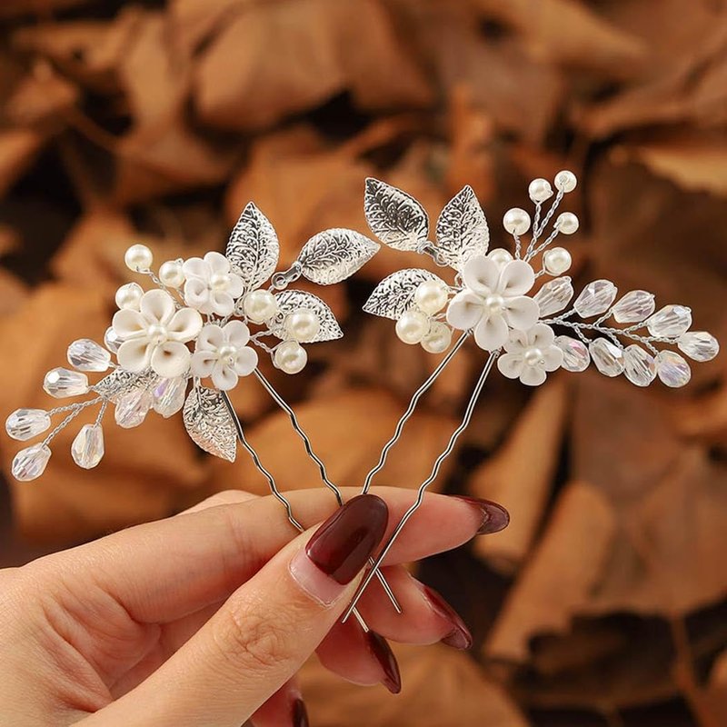 Brishow Flower Bride Wedding Hair Pins Silver Leaf Hair Pieces Bridal Pearl Hair Accessories for Women and Girls