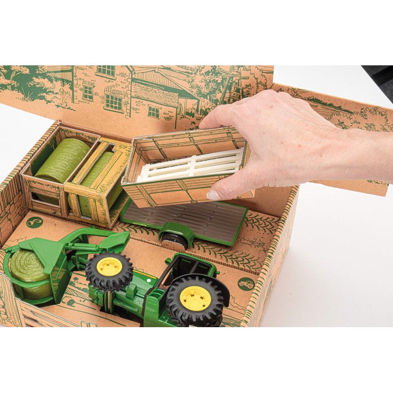 - Collectible Toy: Interactive toy comes with an 8 inch tractor, flatbed wagon, front loader, 3 bales, 4 cows and fencing