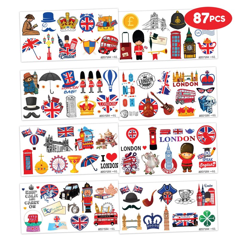 British UK Temporary Tattoos - 87PCS London England Flag Themed Stickers for Kids Birthday Party Supplies, Decorations, Favors, and Prizes - Cute Gifts for Boys and Girls Ideal School Prizes Rewards