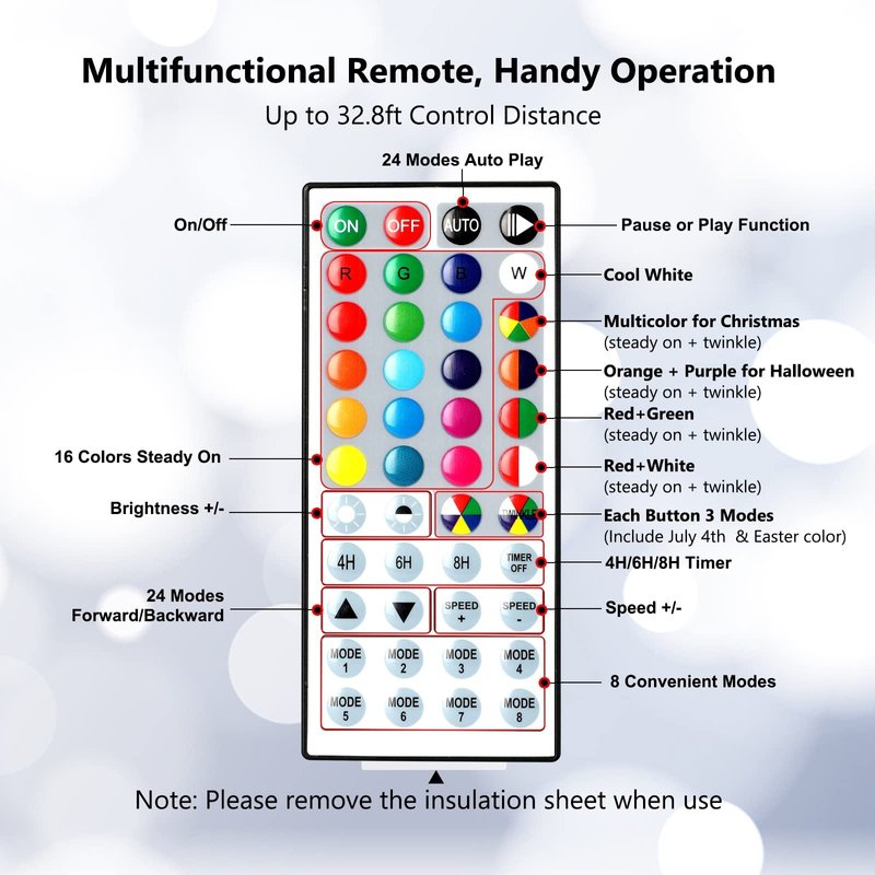 - 【Different Timer Options & Memory Function】Color changing string lights have a memory function, no need to repeat settings. Set "4H" "6H"& “8H” by remote, the Christmas fairy lights will be automatically on for 4/6/8 hours and off for 20/18/16 hours per day. Press the "Time OFF", and the timer will be canceled.【Note】While the timer is activated, the red indicator light on the white controller will be on; while the timer is canceled, the red indicator light is off.