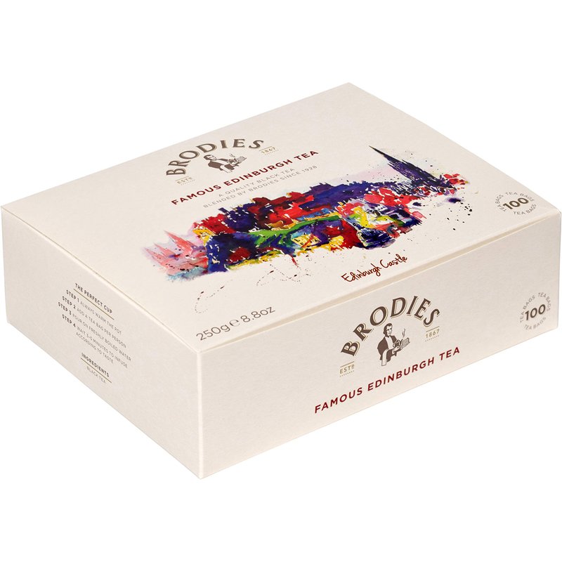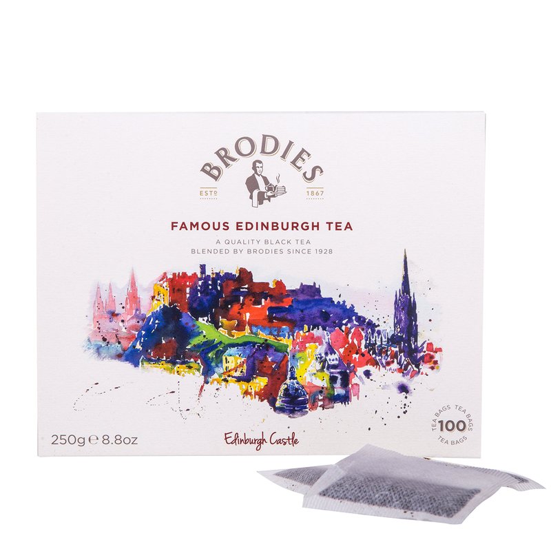 Brodies Famous Edinburgh Tea in a box of 100 tea bags. Brodies Famous Edinburgh tea is blended in Scotland. Brodies Famous Edinburgh tea is a quality black tea blended by Brodies in Scotland's capital city for over 65 years.