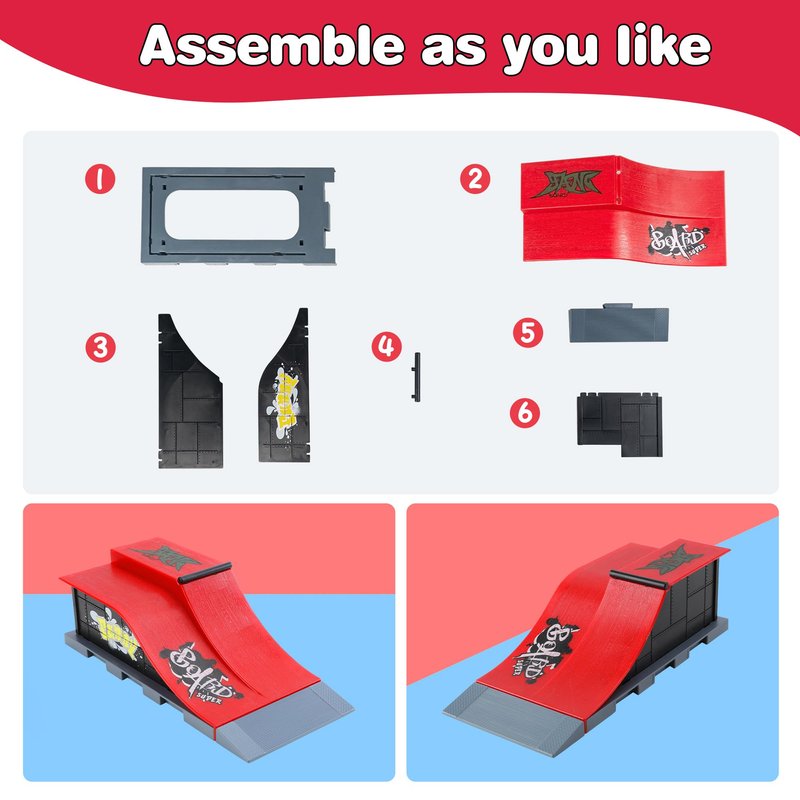 - -[Advanced Playability]-Developing children's imaginations and creativity by using skatepark set,finger bike, bike wheels, scooters, motorcycle,roller skating, trousers, screwdriver to combine difficulty level.