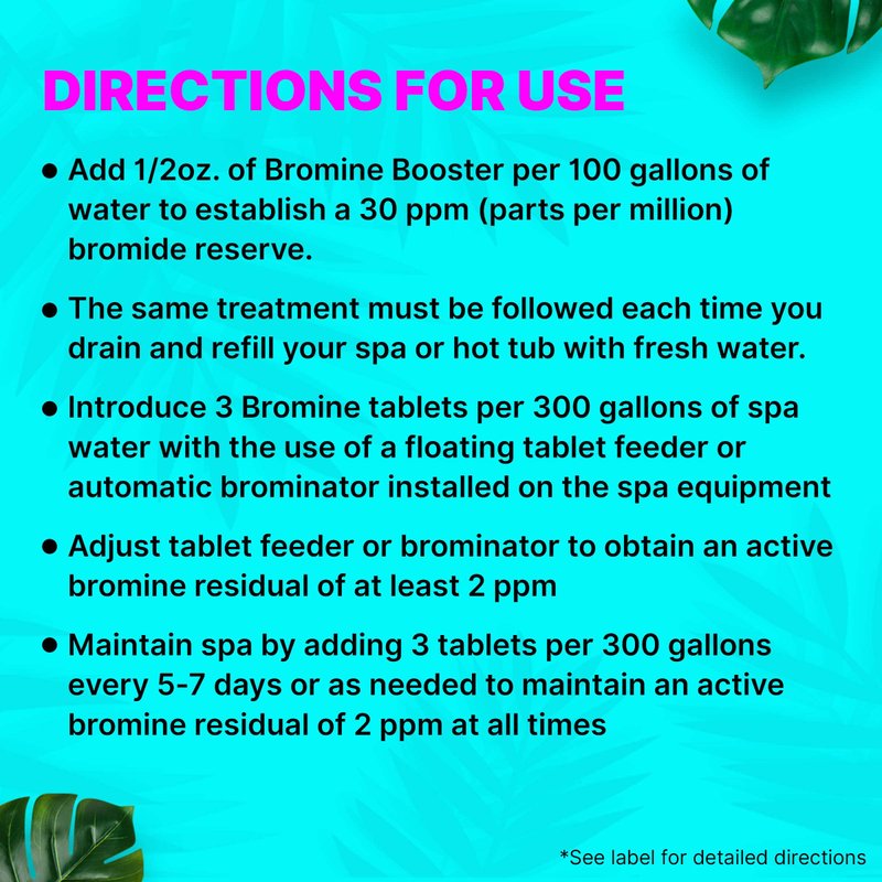 To use, simply add the recommended amount of bromide tabs or bromide powder to your hot tub water, and let it dissolve. The fast-acting formula of this bromine powder for hot tubs ensures that it gets to work quickly. Please note that this product is not a stand-alone spa sanitizer – it's meant to be used with other sanitizing agents like hot tub bromine tablets or spa chlorine.