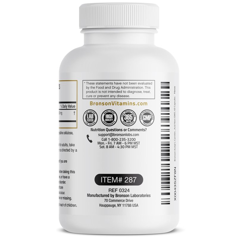 Bronson Acetyl L-Carnitine provides 500 MG per capsule for superior support. Take 1 capsule one to three times daily to support overall good health and well-being.* Laboratory tested and free of GMOs, Gluten and Soy, Bronson Acetyl L-Carnitine is in-house tested and carefully manufactured by trained professionals in our state-of-the-art facility in Hauppauge, New York.