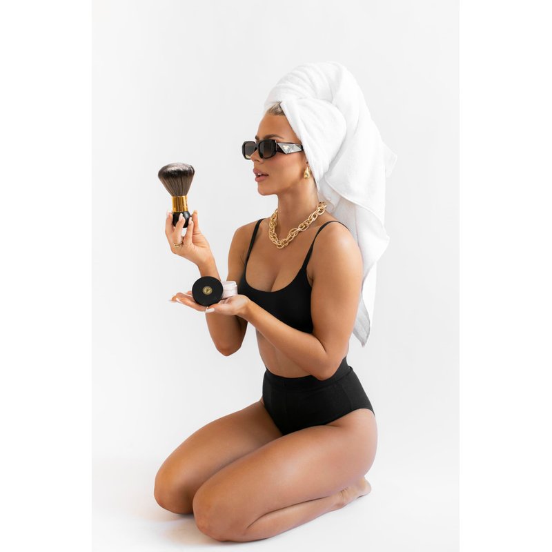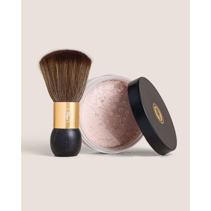 Our Quick-Dry Powder Kit is designed to dazzle your skin with a subtle shimmer, perfect for special occasions to highlight that self-tan glow. This delicate Bronze Cactus Powder glides effortlessly onto the skin, leaving a smooth, non-sticky finish. The Bronze Cactus Powder Brush features a large, dense, and incredibly-soft head for even distribution and blending of powders, blush, and foundation, achieving a consistent matte look. This high-quality synthetic bristle brush is ideal for both professional and home use, ensuring a natural makeup appearance.