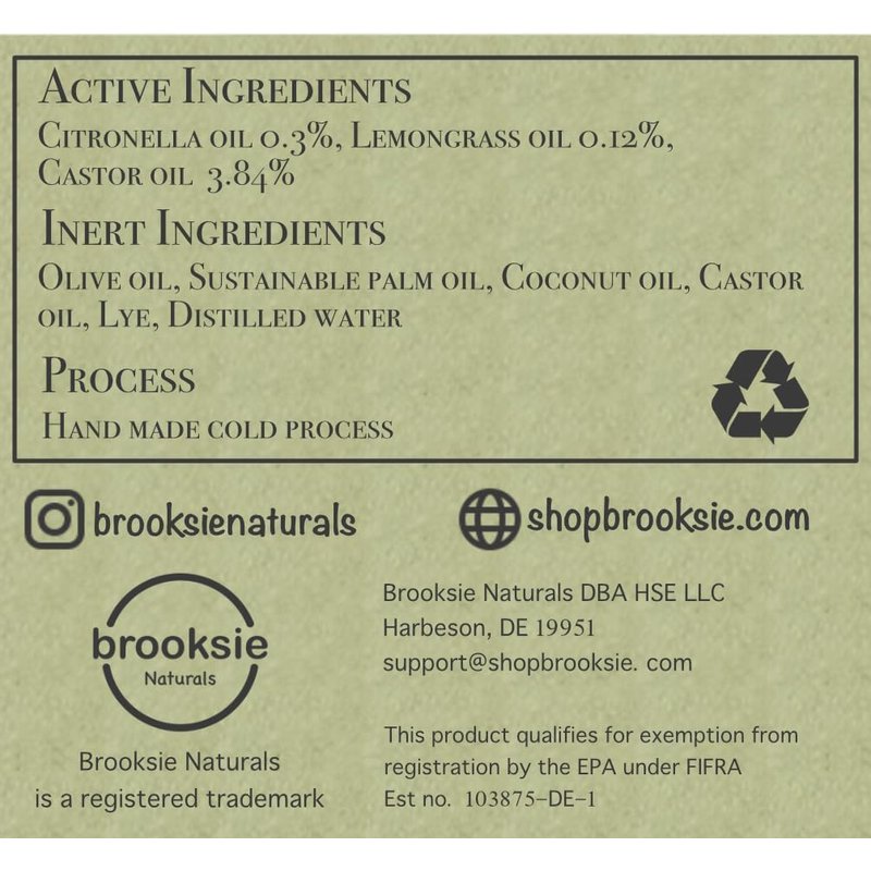 If you enjoy spending time outside but despise those pesky insects, then Brooksie Insect Repellent Citronella Soap is perfect for you! It is free of deet and other harsh chemicals, and can easily be applied just like any other soap. Not to mention our all natural essential oils will leave your skin smelling amazing! Brooksie Soap is handmade by husband and wife duo in the US. We truly believe in the product we sell as it has been our go-to for quite some time since we live in a heavily wooded area with lots of insects. And now we are passing it on to you!