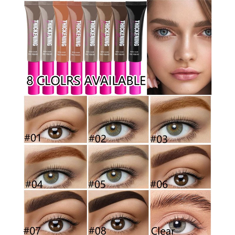 - THICKENING BROW GEL KIT - You will get 1Pcs thickening eyebrow gel,1Pcs clear setting brow gel,1 brow razor and 1 eyebrow brush. The thickening brow gel contains high-quality man-made fiber, thicken and stereotype all types of eyebrows with a natural finish that lasts up to 16 hours with this set brow mascara in 8 high-impact inclusive shades.