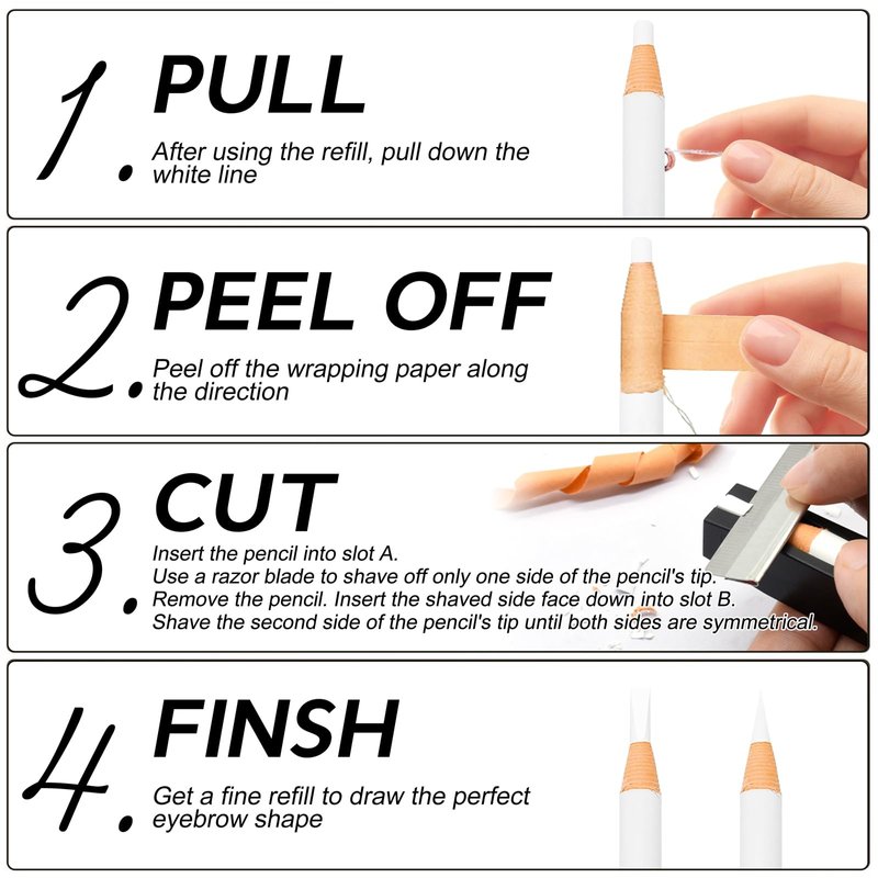 - 【Peel-Off Eyebrow Pencil】Fast, simple and convenient, Just need to pull the string on their side and peel the excess off, and then use a small sharpening blade and carve the tips of the pencial.