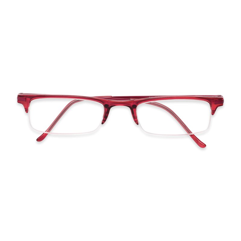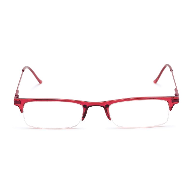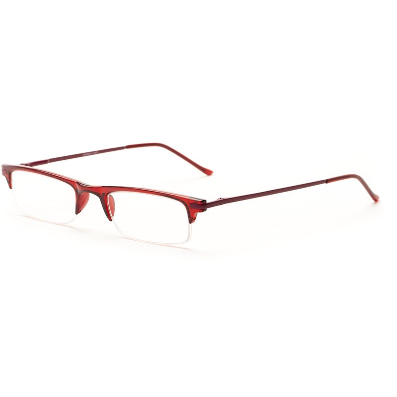 - THE BISHOP +2.00 RED: These lightweight, thin reading glasses are available in classic brown or black - or trendy blue or red. Spring temples provide a comfortable fit, while the semi-rimless lenses allow you to peek over the top when not reading.