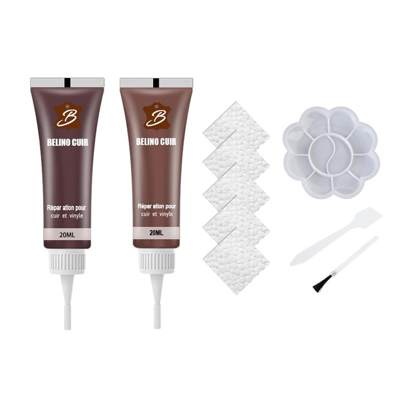 - PROFESSIONAL LEATHER REPAIR KIT: We thoughtfully prepared a brown + coffee color leather repair kit for car seat, and it comes with 5PCS embossed paper, 1pcs scraper, 1pcs brush, 1pcs palette. Believe me, these leather vinyl repair kit can make your sofa restore to its former glory!
