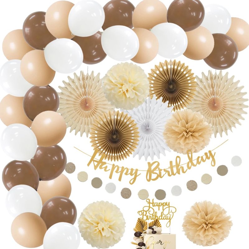 Brown Beige Birthday Party Decorations Paper Fans Cream Brown Birthday Decorations White Brown and Beige Balloon Garland Kit Boho Birthday Party Decorations for Women Girls with Birthday Cake Topper