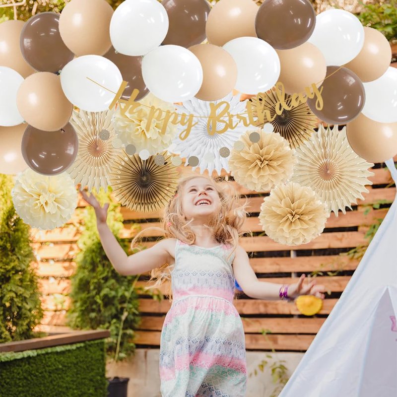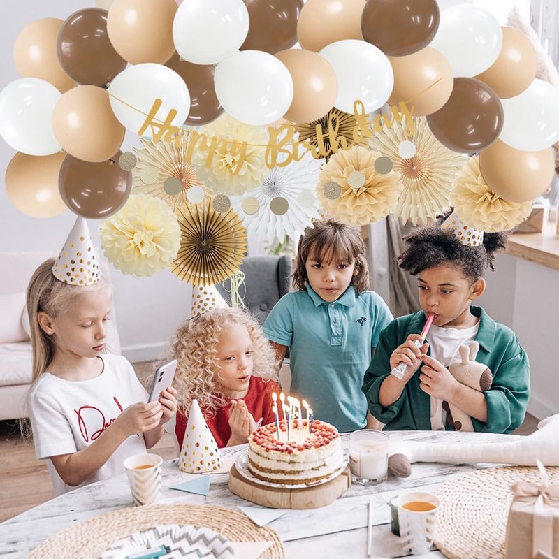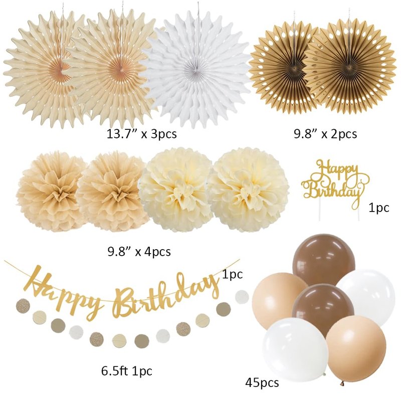 - 【Brown Birthday Party Decorations Kit】 5pcs paper fans decorations, 4pcs brown cream tissue paper pom poms flowers, 1pc happy birthday banner gold, 1pc happy birthday cake topper gold, 1pc circle dot paper garland, 45pcs latex balloons