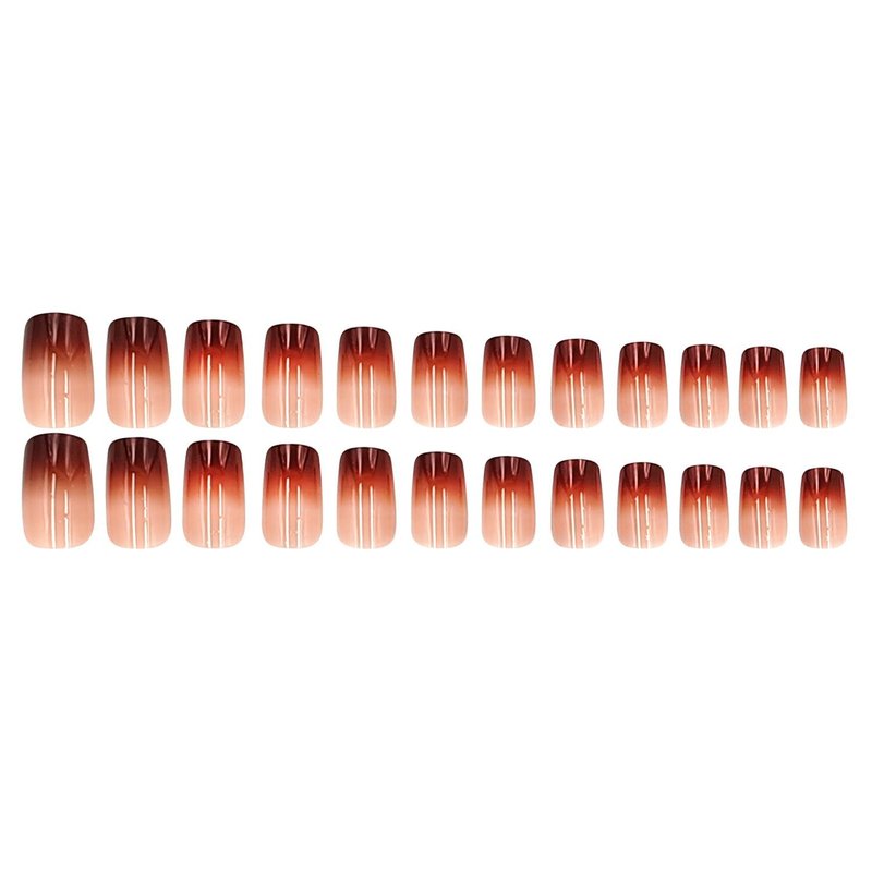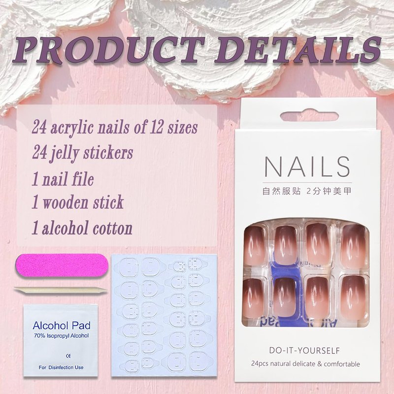 Package Contents: 24pcs false nails,24pcs Jelly glue, 1pc wood stick, 1pc mini nail file, 1pc alcohol pads.