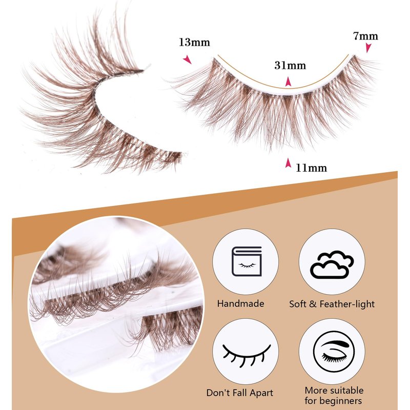 - Brown Lashes Natural Look: Brown eyelashes are more natural to wear and more suitable for individuals with brown, blonde, or other light-colored hair; The carefully selected brown tones go better with your hair and eyebrows color more than black, radiating unique and captivating qualities; Very beginner friendly. No makeup and light makeup is the best choice;
