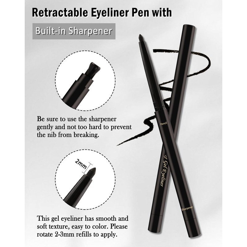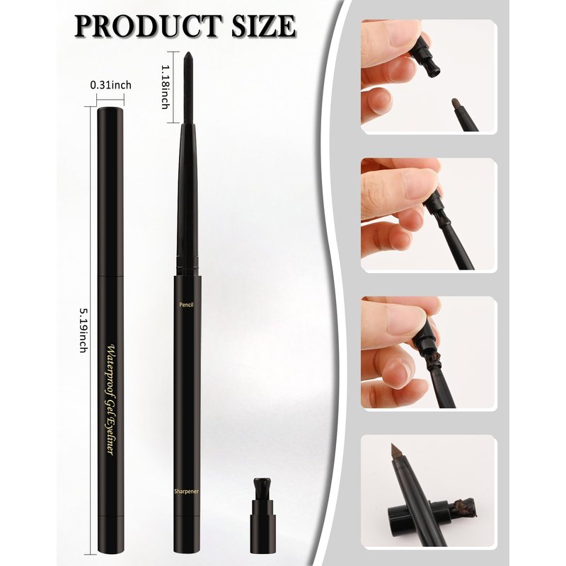 - Gel Cream Eyeliner Pencil - Waterproof gel eyeliner pen with built in sharpener, intense, creamy color glides on as effortlessly as a liquid liner with the control and staying power of a pencil. Our eyeliners are gentle, and safe for sensitive eyes of older women plus. Fearless of rain, humidity, sweat and tears, it lasts all day long!