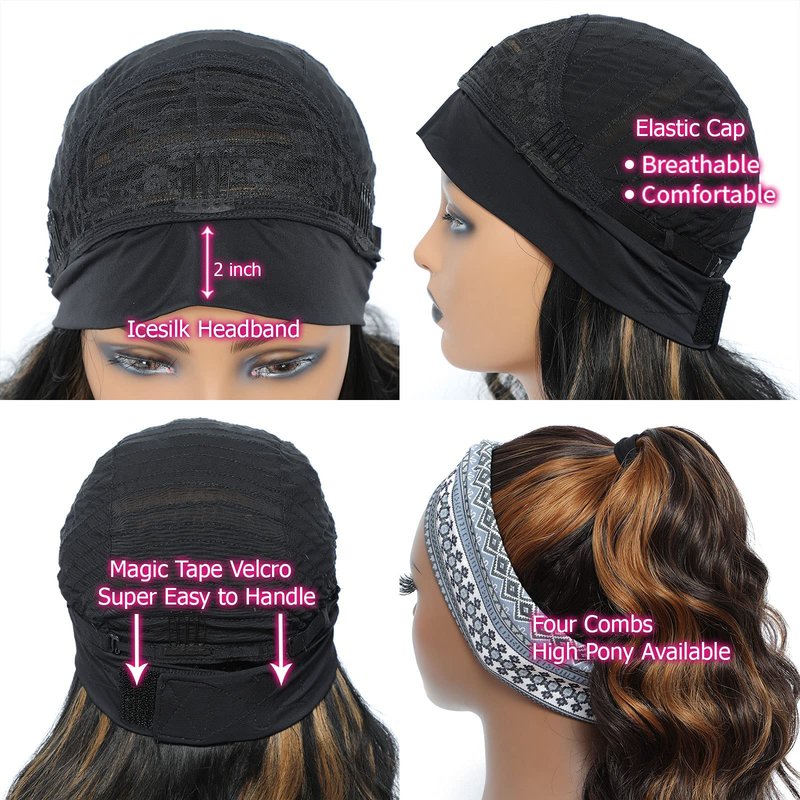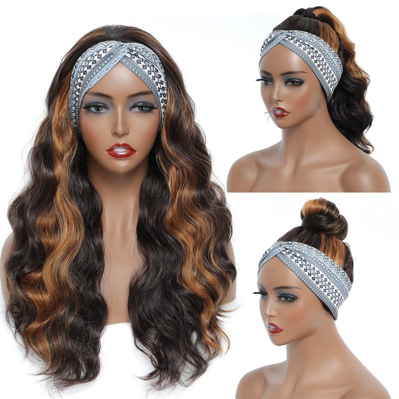3.Hair Color: Brown headband wig with highlights colored dark brown and blonde