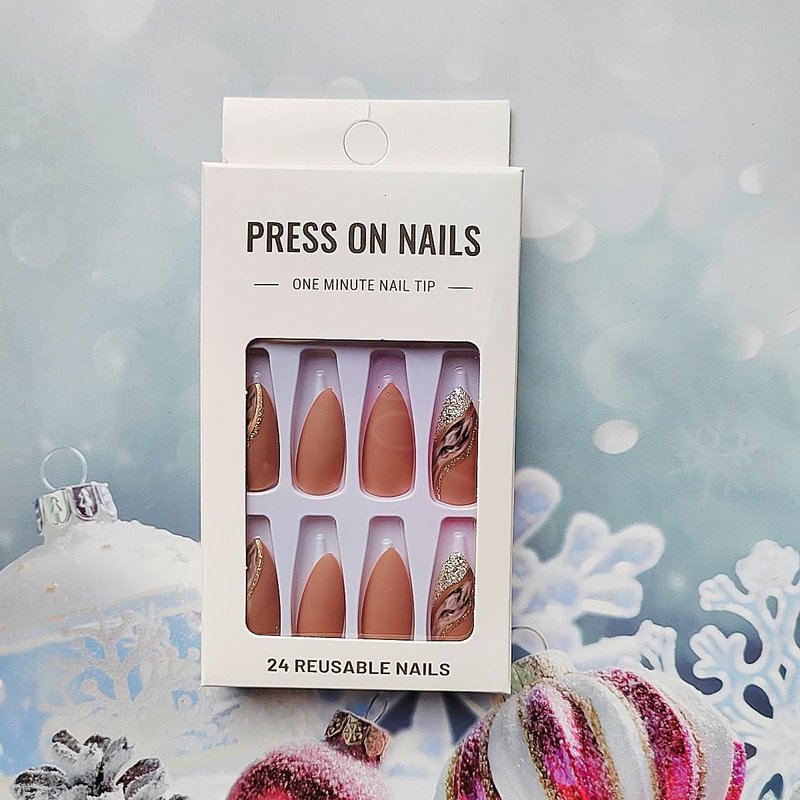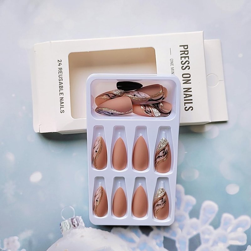 Brown Press on Nails Medium Almond - WLGDLH Fake Nails Black False Nails Press Ons With Curve Gold Glitter Texture Designs Nail Tips Full Cover Glue on Nails Acrylic Nail Kit for Women Manicure 24 Pcs
