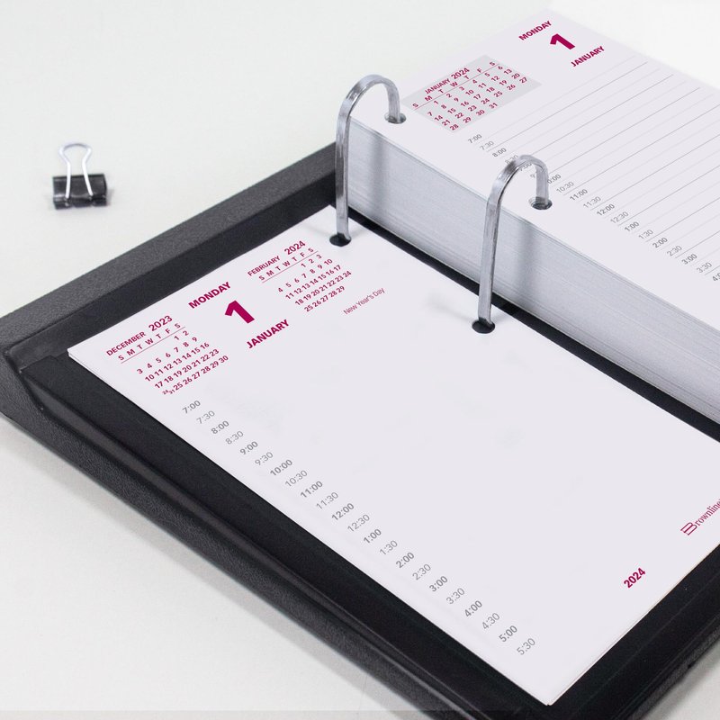 - Daily desk calendar refill with weekday-on-two-pages format. English