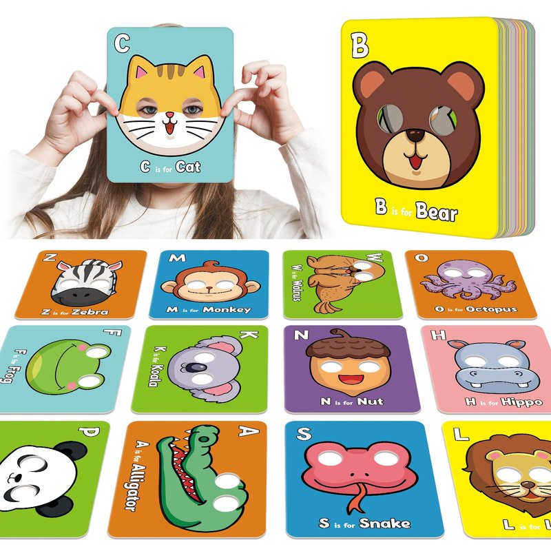 - 【Learn Through Play】Each card is specially punched, and children can play by aligning their eyes with the round holes and transforming into 26 fun cartoon characters. In playing, children can interact with their partners and achieve immersive learning.