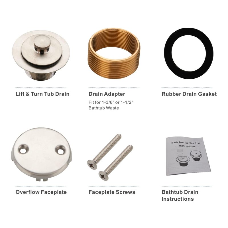 - DRUABLE QUALITY : This brushed nickel tub drain and overflow kit is made of solid brass,stainless steel material ,this tub drain kit provides strength and durable quality for long time use.