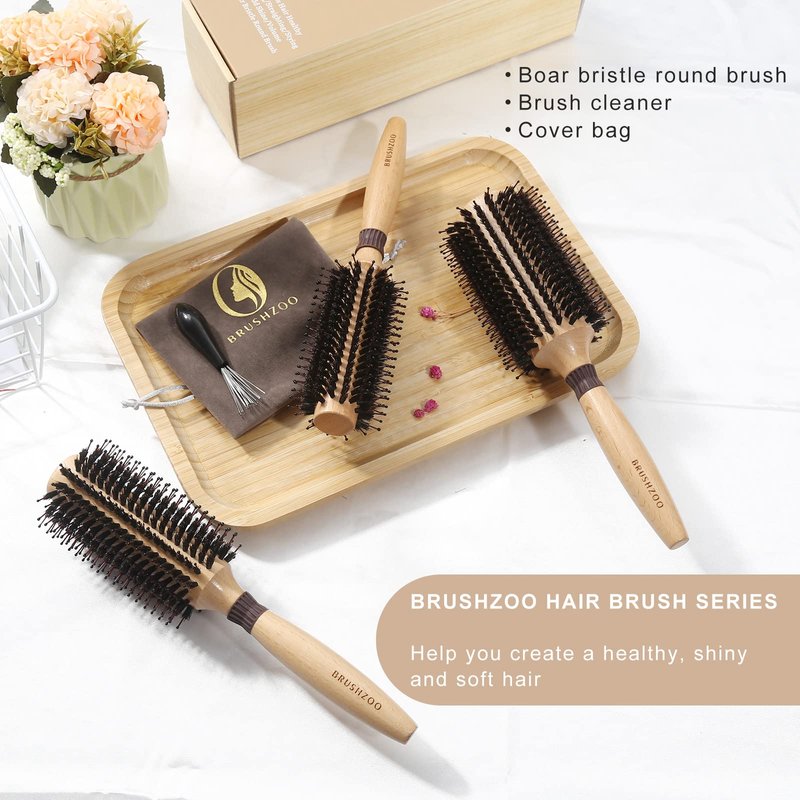 BRUSHZOO Round Brush, Boar Bristle Round Brush for Blow Drying, Add Shine/Volume, Hair Bursh with 100% pure Boar Bristle and Nylon Pins for Styling Curling and Straightening