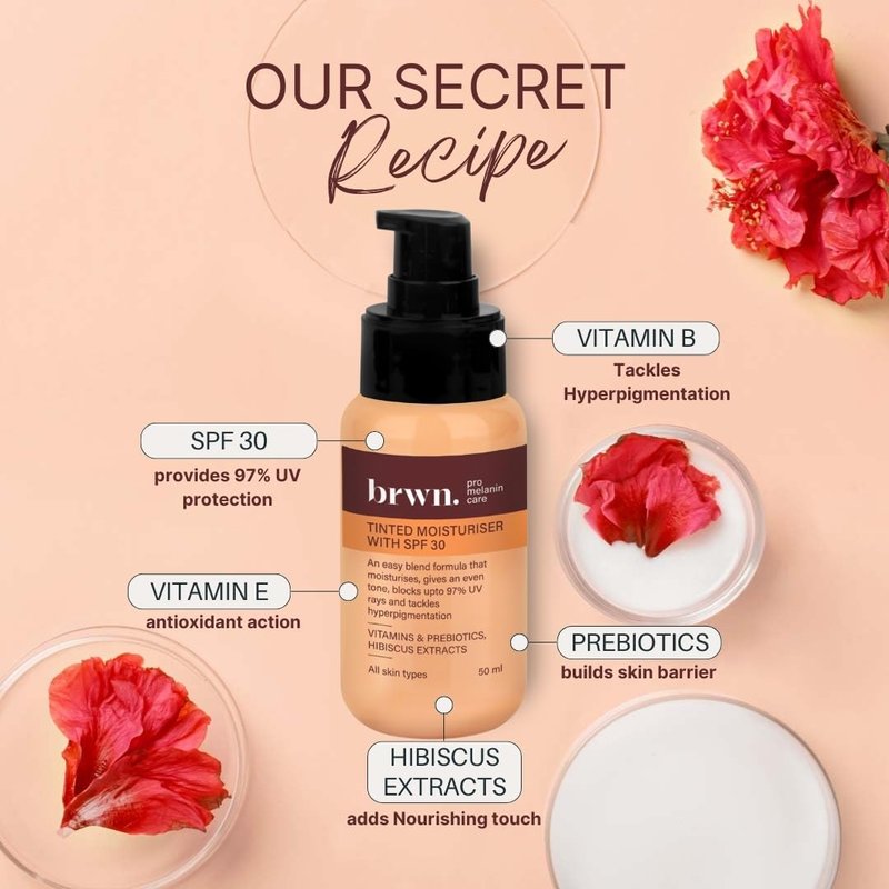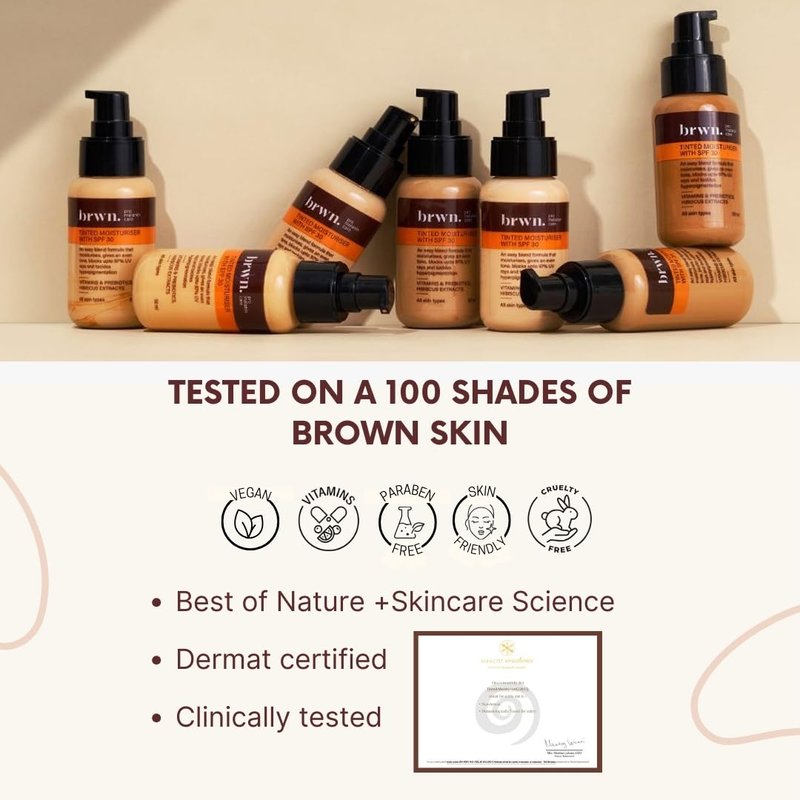 Brwn tinted moisturizer is specifically designed to cater to the unique needs of brown skin tones. This revolutionary 3-in-1 formula combines hydration, SPF 30 sun protection, and a flawless skin tint, delivering a dewy, radiant finish that enhances your natural beauty. Enriched with a perfect balance of Vitamin B, Vitamin E, Prebiotics and Hibiscus Extracts, this tinted moisturizer tackles hyperpigmentation and provides essential nutrients to nourish and even out your complexion. The lightweight, easy-blend formula offers sheer coverage, allowing you to achieve a natural, "no makeup-makeup" look that lets your skin breathe and glow. With SPF 30 protection, this tinted moisturizer effectively blocks up to 97% of harmful UV rays, shielding your skin from sun damage and preventing the formation of dark spots and premature aging. The vegan, cruelty-free, and paraben-free formula is suitable for all skin types, making it the perfect choice for everyday use. More than just a BB cream, this pro-melanin tinted moisturizer goes above and beyond by combining the power of prebiotics, vitamins, and hibiscus extracts to deliver superior skincare benefits. These ingredients work synergistically to nourish, hydrate, and improve the overall health and appearance of your skin, promoting a more even skin tone and a radiant, youthful complexion. This all-in-one tinted moisturizer for face is your go-to product for effortless, glowing skin. Its lightweight, non-greasy formula blends seamlessly into your skin, providing a comfortable, breathable wear.. Elevate your skincare routine and discover the confidence that comes with beautiful, even-toned, and protected skin.