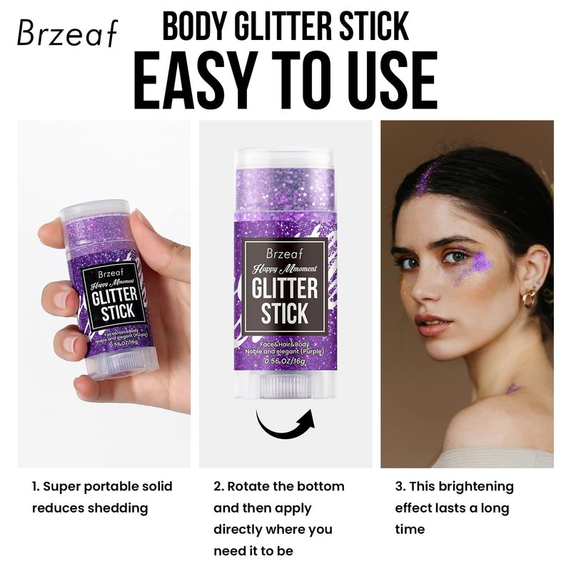 - 【Bright and Lasting Hold】Our purple body glitter stick is makeup product designed specifically for use as accessories for events such as music festivals, concerts, parties or holiday raves. Our purple face glitter stick will sparkle and shine, the color and shine of the sequins change with visual changes, releasing a dazzling light, allowing you to party and create your own sparkling look.