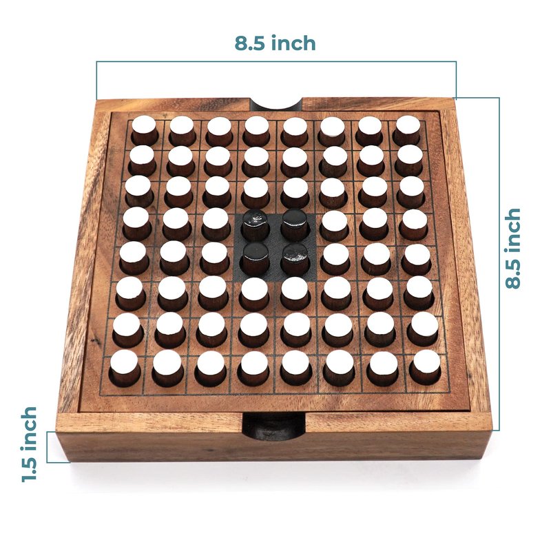 The Othello strategies game for winning. This Othello game including wooden Othello board of 8 by 8. that designed from natural wood and 64 wooden reversible pieces of black and white colors. This game playing by two players, one player plays black side up and another plays white up (32 reversible pieces per each player) and players need to place a color piece to make a row on horizontal, diagonal or vertical to turn the opponent piece to his/her color side. Entertainment for Everyone This game was designed to provide an entertaining challenge that both kids and adults can enjoy. It makes for a great mind-strategies exercise that inspires players to think of winning the game. Natural Wooden Games The set is made of 100% natural wood that has been used and every piece of the set is handcrafted with great precision to ensure an easy and correct fit. The wood is hypoallergenic and chemical free with no discernible odor.