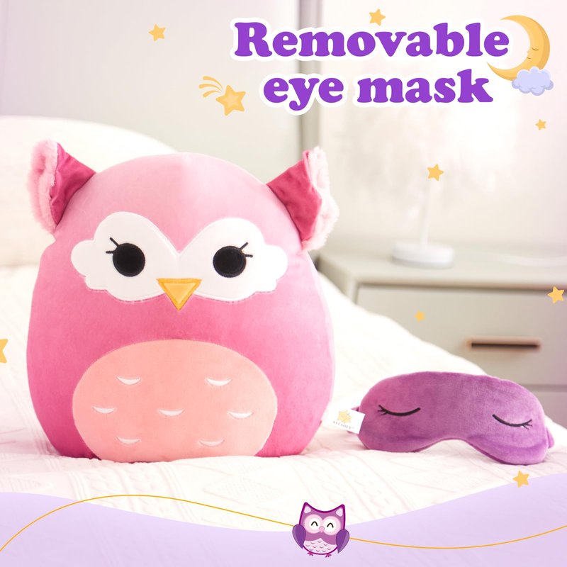 Cute Owl Soft Plush Pillow Collection with Removable Eye Mask Squishy Owl Stuffed Animal Cushion Hugging Stretchy Nap Pillow Christmas Holiday Birthday Gifts for Toddlers Kids, 12’’