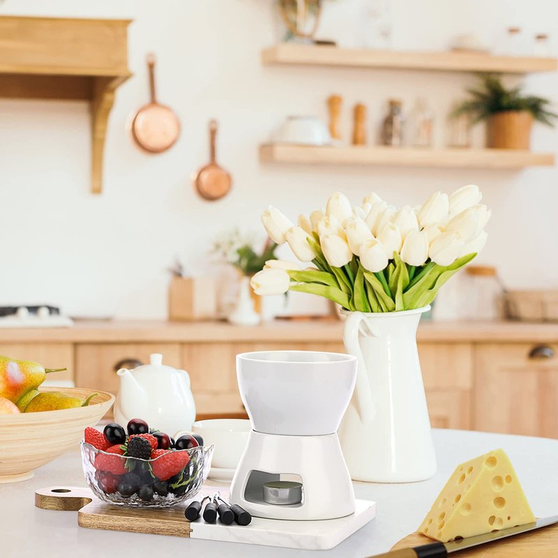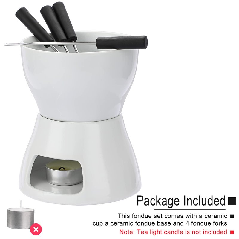 - 🍲PACKAGE INCLUDED - This chocolate fondue pot butter warmer bowl set comes with a ceramic cup,a ceramic fondue base and 4 fondue forks. Note: Tea light candle is not included.